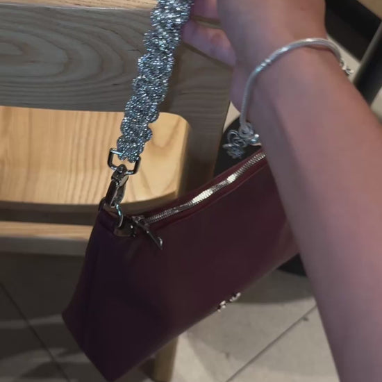 El Strap Cristal está tejido a mano con una delicada tira de brillos que incorpora pequeños diamantitos, creando un efecto luminoso y sofisticado.