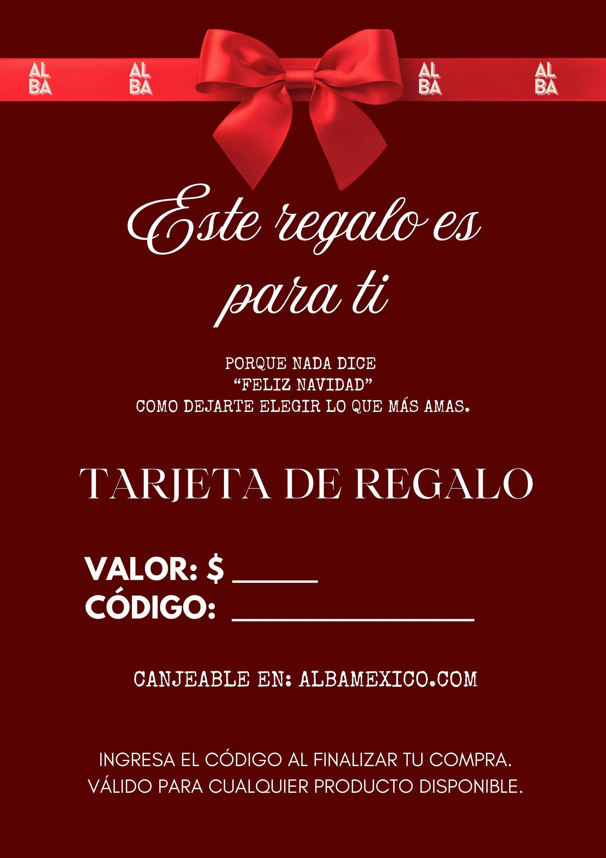 La tarjeta de regalo ALBA es la opción perfecta cuando quieres regalar algo especial, pero prefieres que la persona elija lo que más le guste. Disponible en diferentes montos, se puede usar en toda nuestra tienda online para comprar bolsos, zapatos y accesorios personalizados.